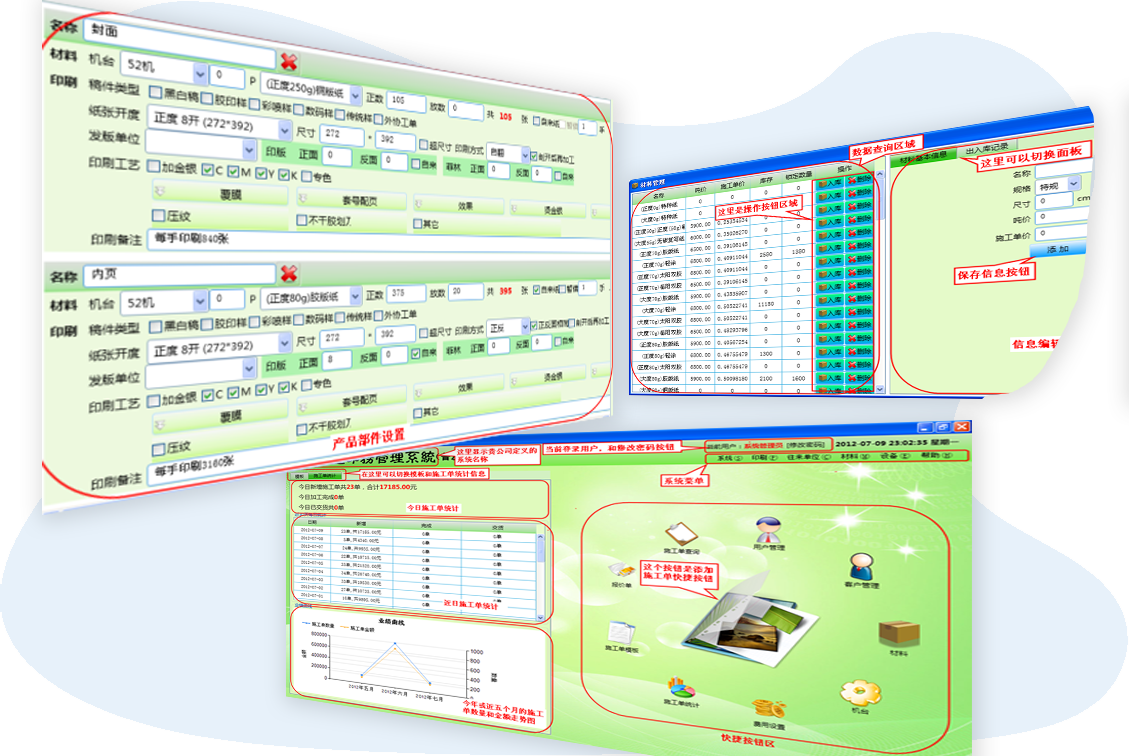 幫助印刷企業解決算價不準、多個業務員算價不一致、印刷安排不智能的問題。靈活的算式公式編輯功能,支持階梯價、固定價、超尺寸價格等規則設置。包括材料管理、印刷單管理、機臺管理、客戶管理等功能。